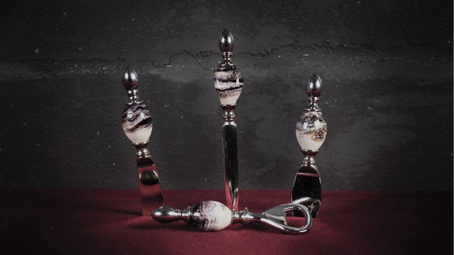 Handcrafted table accessories in Murano glass. Artisan paper knife, corkscrew, butter spreader and cheese knife – Made in Italy by Venetian artist.