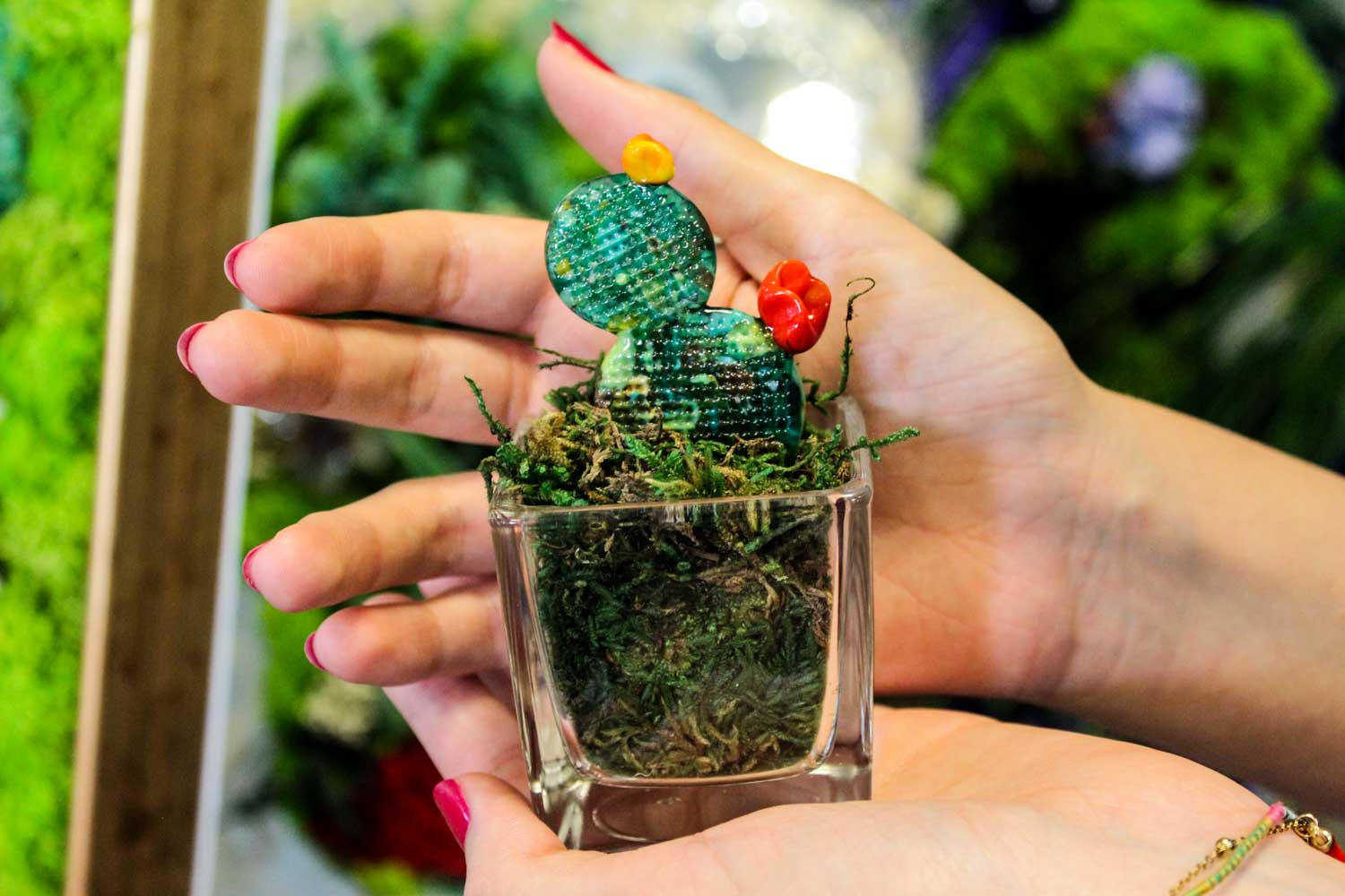 Succulent plant of prickly pear with round leaves and various shades of green, this is a true jewel of nature, a precious glass artistic creation hand-forged by our master glassmakers from the Murano island with the “lume” technique. Its fleshy leaves seem to be illuminated by light, as if they were small treasures hidden in the terracotta vase that accompanies them. Its intense and bright green, together with the other colors of the glass, create a unique and spectacular color contrast, capable to catch anyone’s attention and glance. This glass succulent plant, surrounded by stabilized moss, is a precious gift, an idea for a bonbonniere that combines the beauty of nature and the millenary art of Murano’s glass makers. This is a present that will last over time, like the indelible memory of a special moment. Each time that you’re going to look at this Murano glass creation, you will be surprised by its beauty and by its ability to bring elegance at home. A unique and unforgettable gift that will leave an indelible mark in the heart and mind of who is going to receive it.