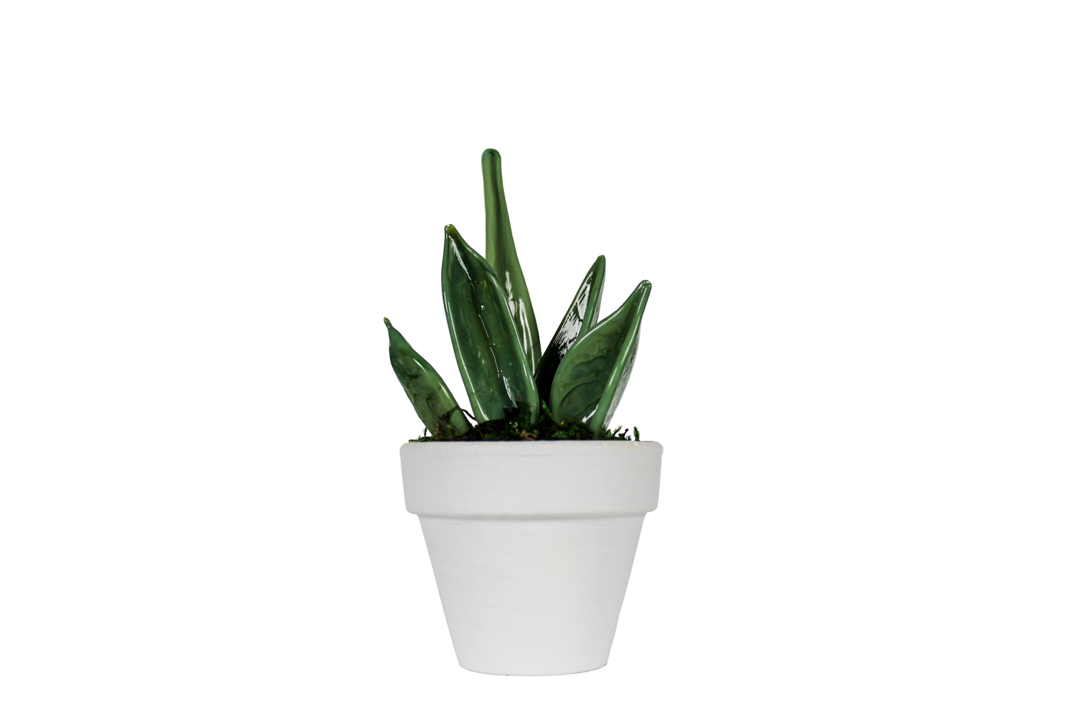 This imitation of a succulent plant with long leaves is a true jewel of nature, a precious glass artistic creation, hand-forged by our master glassmakers from the Murano island with the “lume” technique. Its fleshy leaves seem to be illuminated by light, as if they were a small treasure hidden in the white enameled terracotta vase that accompanies them. Its intense and bright green creates a unique and spectacular color contrast, capable to catch anyone’s attention and glance. This glass succulent plant is a precious gift, an idea for a bonbonniere that combines the beauty of nature and the millenary art of Murano’s glass makers. This is a present that will last over time, like the indelible memory of a special moment. Each time that you’re going to look at this Murano glass creation, you will be surprised by its beauty and by its ability to bring elegance at home. A unique and unforgettable gift that will leave an indelible mark in the heart and mind of who is going to receive it.