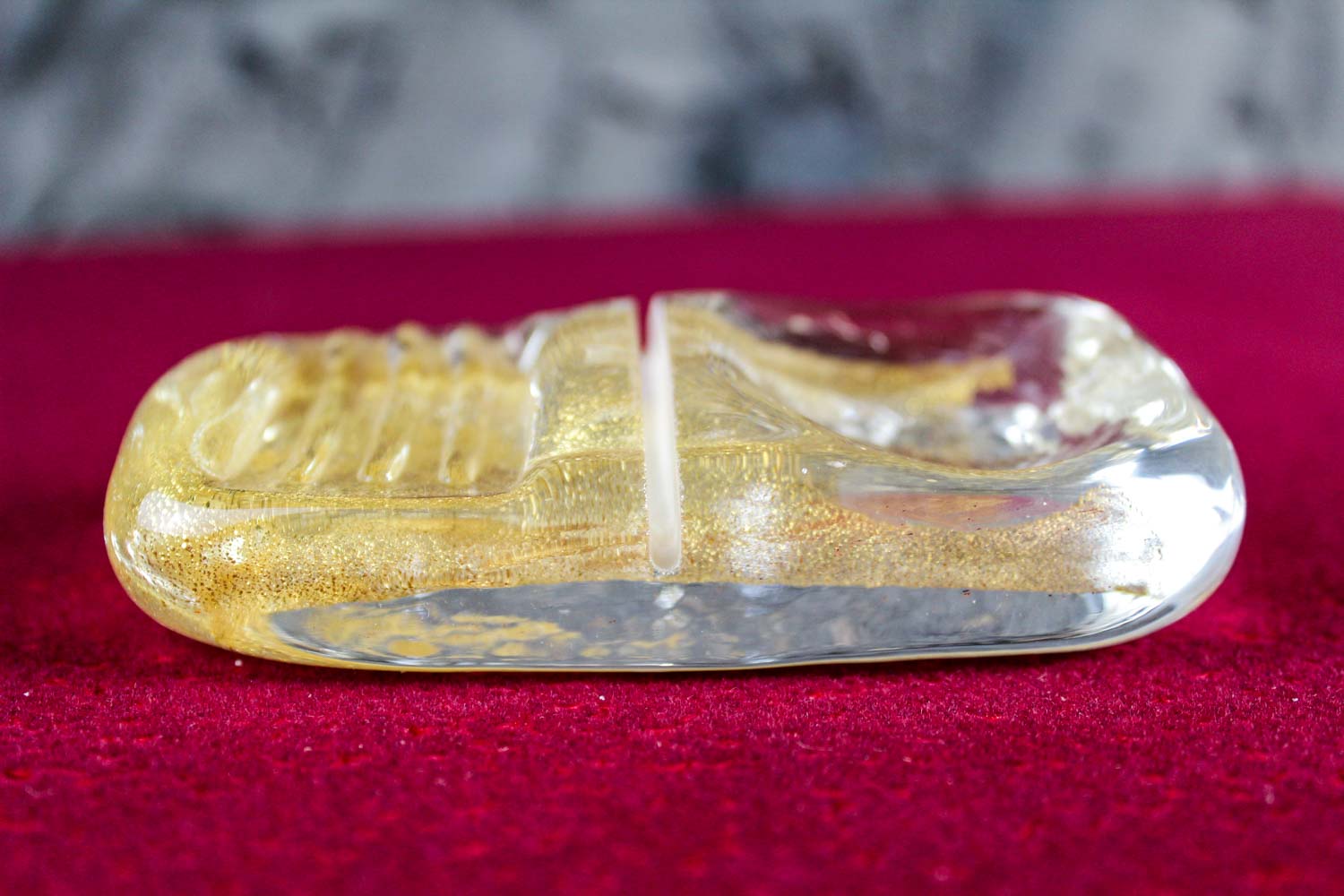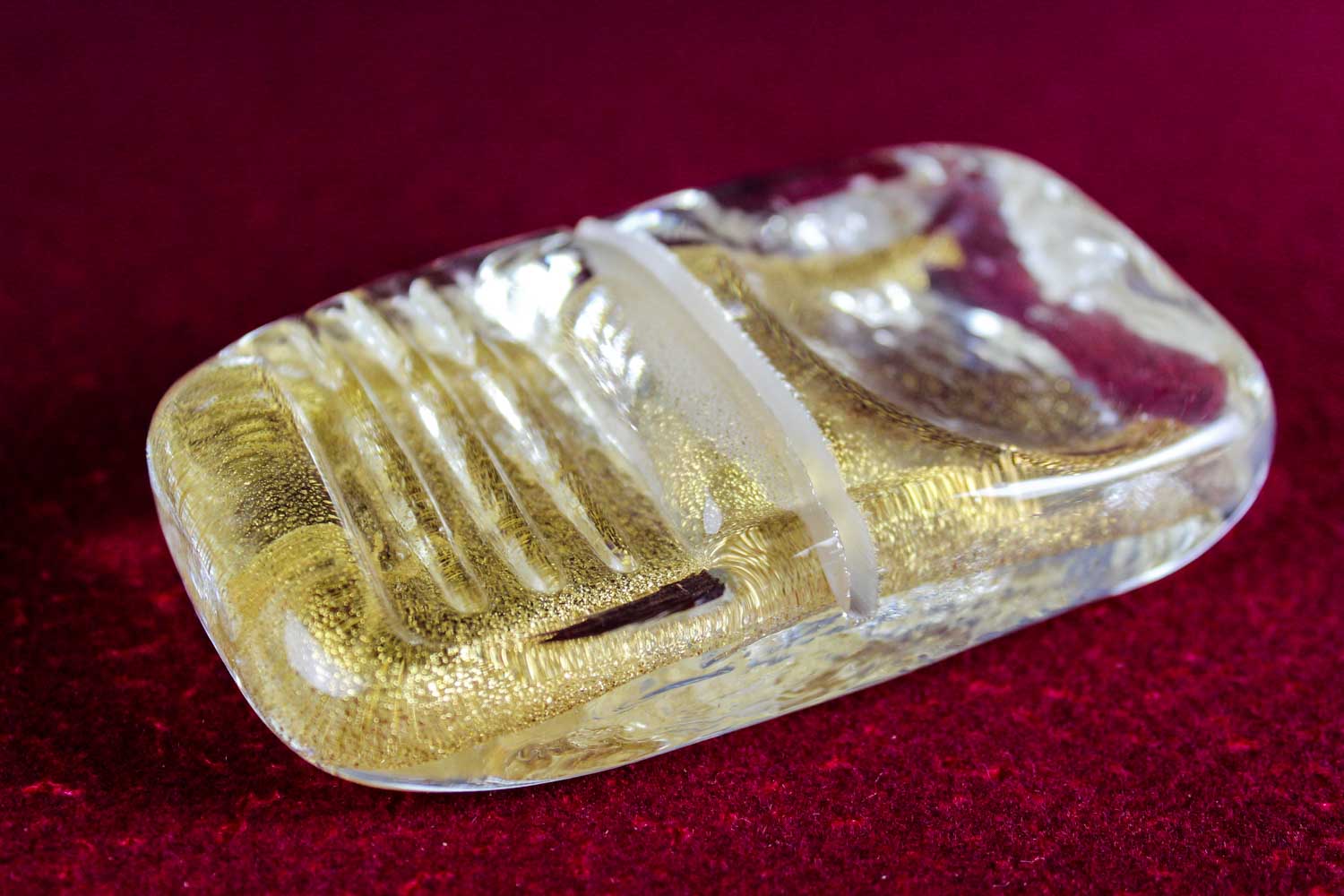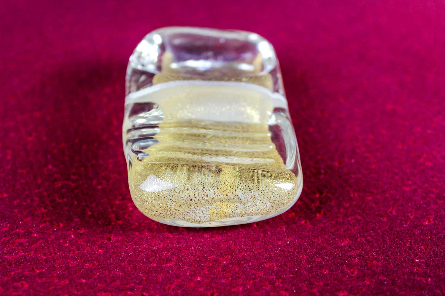 Rectangular-shaped cutlery rest in Murano glass with 24 carats gold leaf inside it, created by our master artisans.An elegant and exclusive artistic accessory to enrich your table’s mise en place. On request (with an additional charge) one of our decorators can customize your cutlery rest with the addition of your name, the name of your activity (hotel, restaurant etc.) or with any other caption and decoration. “VIN” will be even more exclusive thanks to our floral designers with an elegant packaging. Write or call us, we will be glad to give you further information.