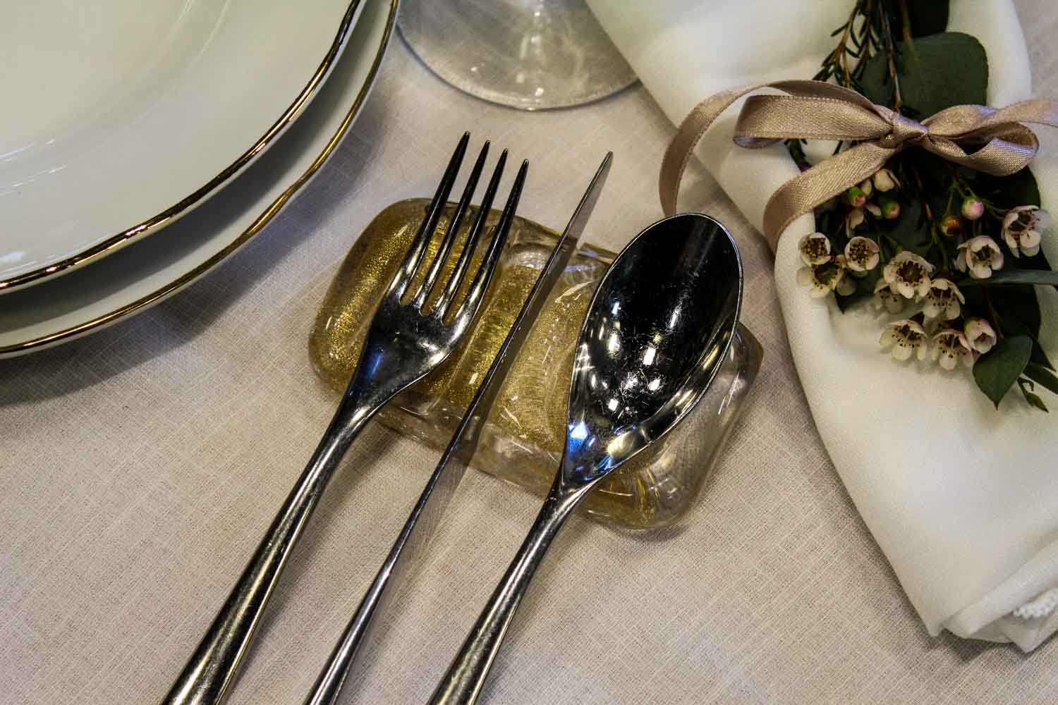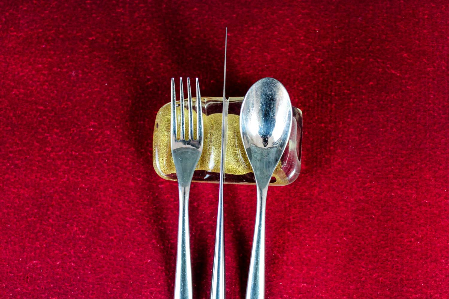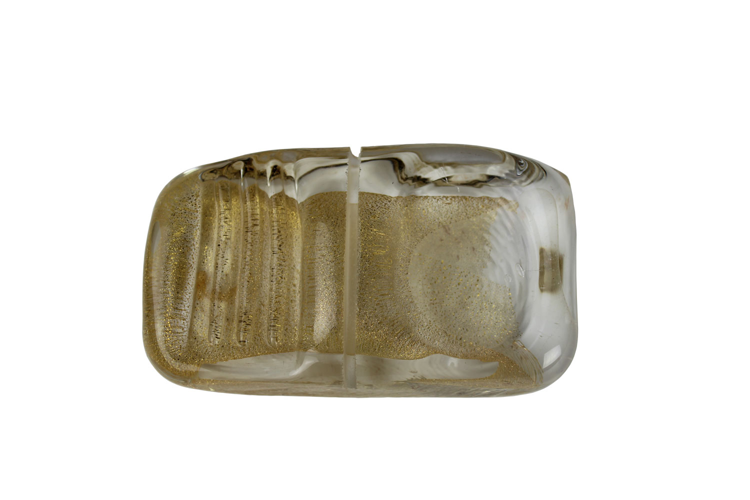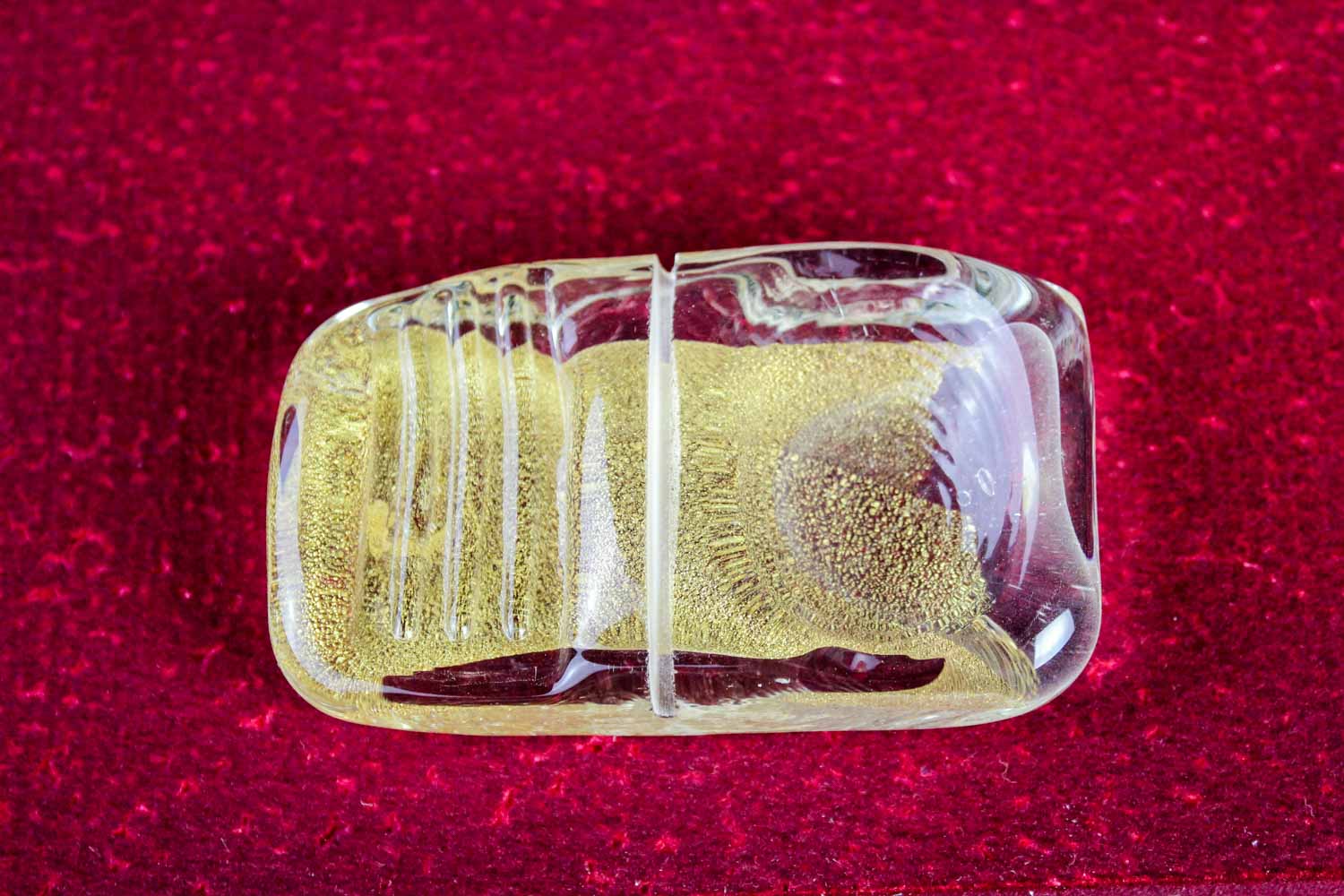 Rectangular-shaped cutlery rest in Murano glass with 24 carats gold leaf inside it, created by our master artisans.An elegant and exclusive artistic accessory to enrich your table’s mise en place. On request (with an additional charge) one of our decorators can customize your cutlery rest with the addition of your name, the name of your activity (hotel, restaurant etc.) or with any other caption and decoration. “VIN” will be even more exclusive thanks to our floral designers with an elegant packaging. Write or call us, we will be glad to give you further information.