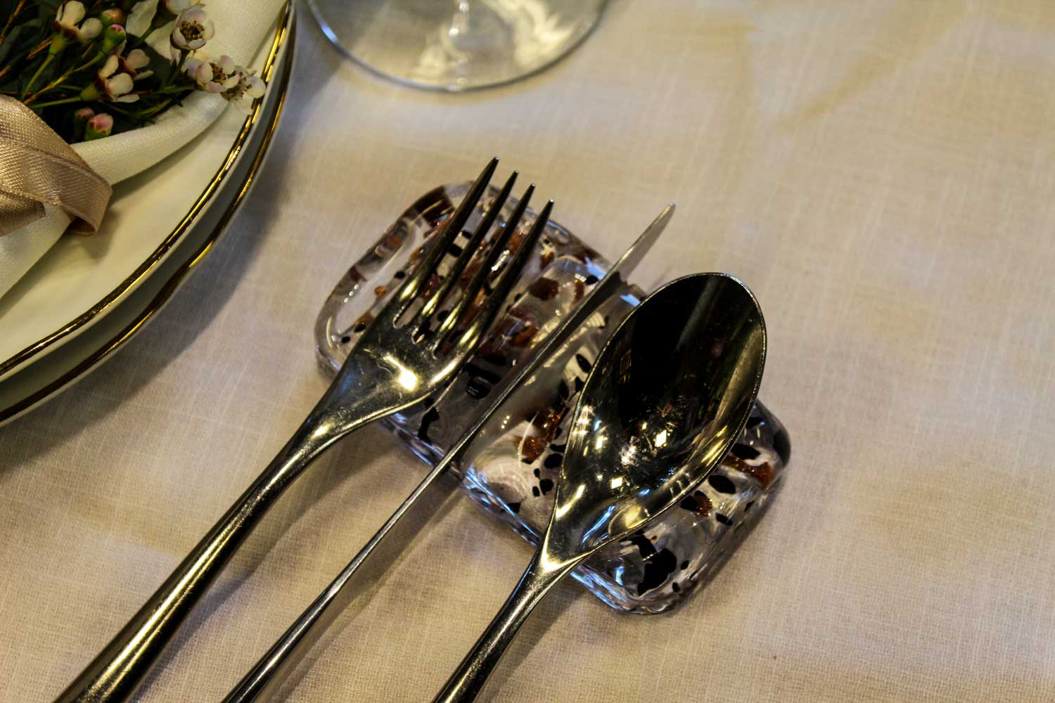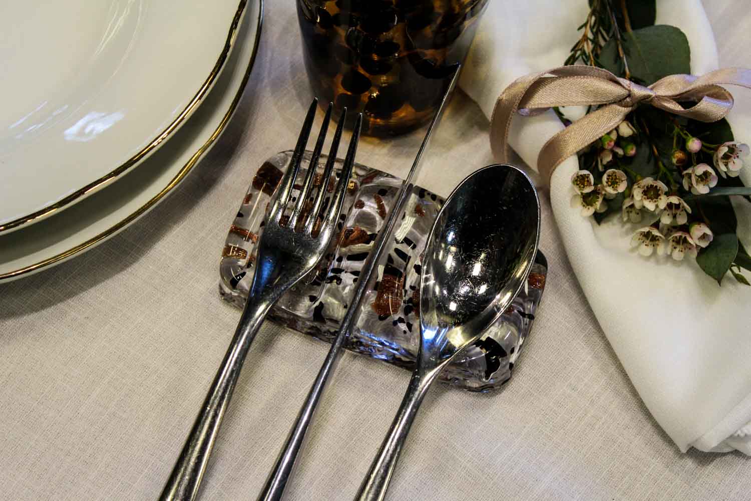Poggia posate dalla forma rettangolare in vetro di Murano a macchie nere e bronzo, creato dai nostri maestri artigiani. Un elegante e prezioso oggetto artistico per arricchire la mise en place della tua tavola. A richiesta (con un supplemento di spesa) un nostro decoratore può personalizzare il poggiaposate da te scelto con l’aggiunta del tuo nome, del nome della propria attività (hotel, ristorante etc.) oppure qualsiasi altra dicitura o decoro. “PIERO” sarà reso ancor più esclusivo dalle nostre floral designers con un elegante packaging. Chiamaci o scrivici, saremo lieti di darti ulteriori informazioni.