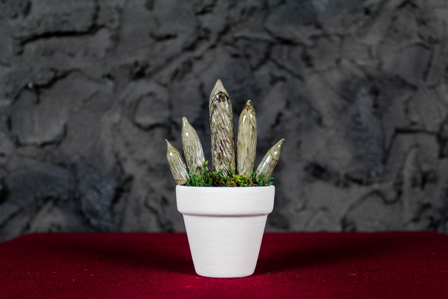 Questa riproduzione di pianta grassa dalle foglie tondeggianti è un vero gioiello della natura, una preziosa creazione artistica in vetro forgiata a mano dai nostri maestri vetrai dell’isola di Murano con la tecnica del “lume”. Le sue foglie carnose e succulenti sembrano illuminate dalla luce, come fossero piccoli tesori nascosti all’interno del vaso in terracotta smaltato bianco che le accompagna. Questa pianta grassa in vetro è un regalo prezioso, un’idea per una bomboniera che unisce la bellezza della natura all’arte millenaria dei maestri vetrai di Murano. E’ un regalo che durerà nel tempo, come un ricordo indelebile di un momento speciale. Ogni volta che guarderai questa creazione in vetro di Murano, sarai sorpresa dalla sua bellezza, e dalla sua capacità di portare eleganza all’interno delle mura domestiche.