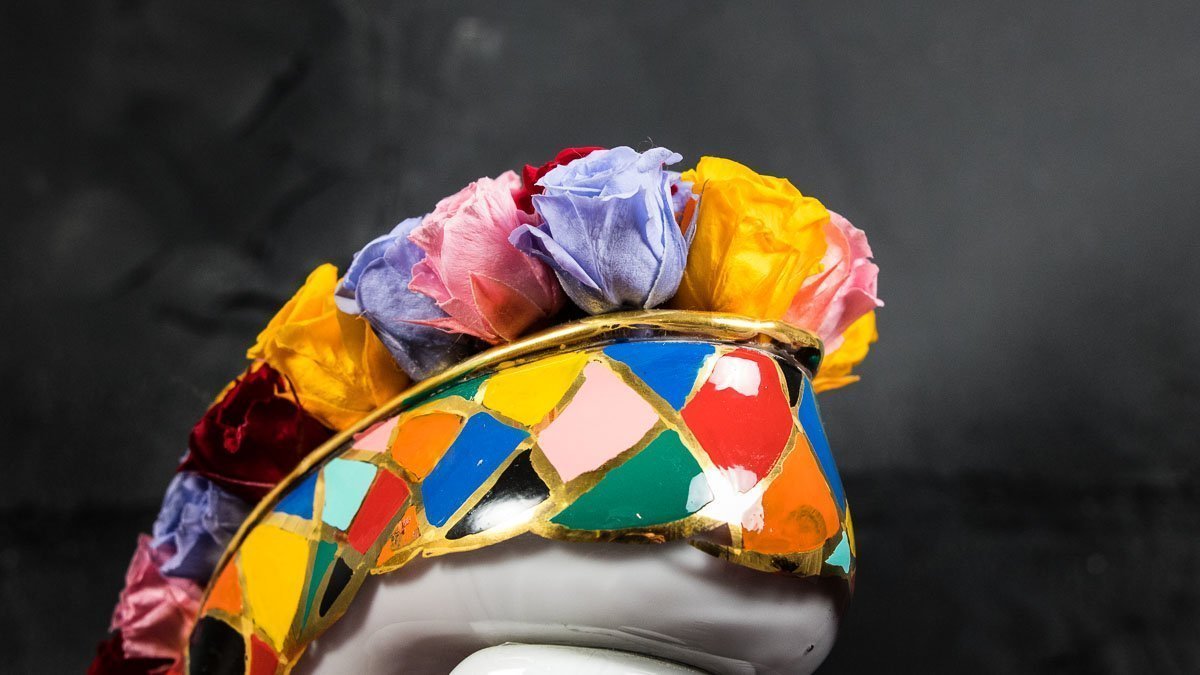 Décolleté in vetro di Murano creata dalle abili mani dei nostri maestri del vetro. Un artigiano decoratore provvede, in un secondo tempo, a riprodurre i colori della maschera di arlecchino con colori policromi e linee oblique in oro 24 carati realizzati a freddo e portati a cottura. Il design essenziale e caratteristico viene rifinito nella parte superiore con una variegata composizione floreale di rose stabilizzate.